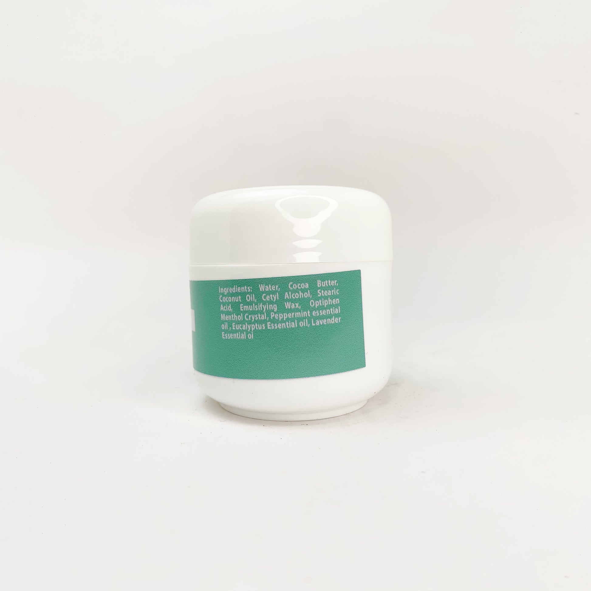 Ingredients: Water, Cocoa Butter, Coconut Oil, Cetyl Alcohol, Stearic Acid, Emulsifying Wax, Optiphen, Menthol Crystals, Peppermint Essential Oil, Eucalyptus Oil, Lavender Essential Oil